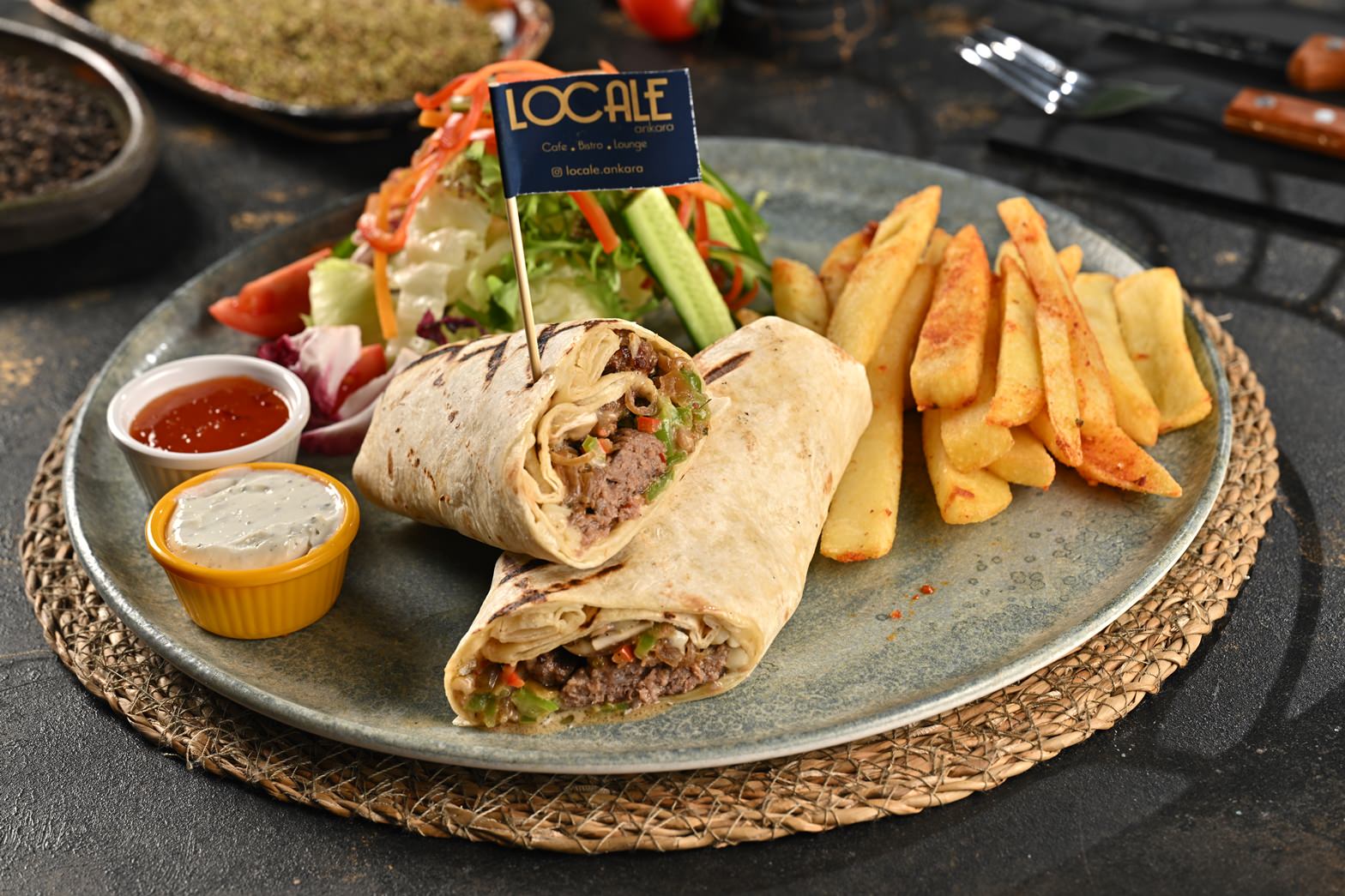 Dana Eti, Mantar, Renkli Biber, Karamalize Soğan, Sweet Chili, Ballı Hardallı Sos, Tortilla Ekmeği, Patates Kızartması, Salata Mix ile