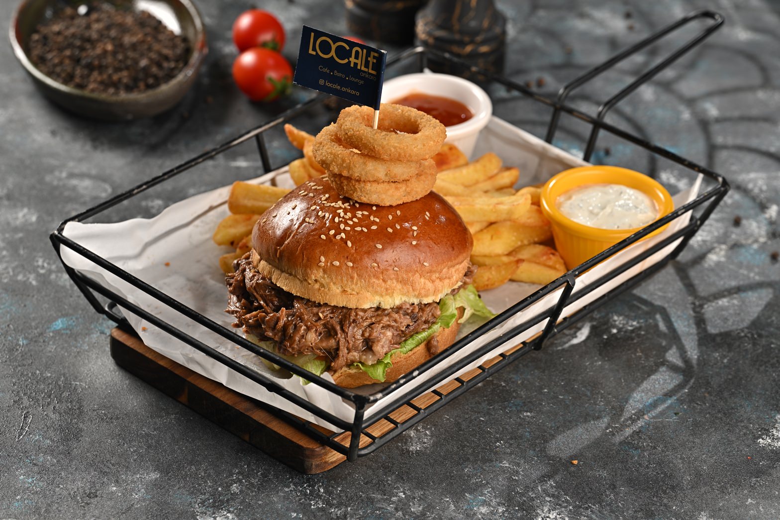 Burger Ekmeği-150 Grm Tiftik Antrikot Eti-Demi Glace Sos-Krema- Yeşillik-Domates-Kornişon Turşu-Sweet Chilil Sos-Dip Sos-Patates Kızartması Eşliğinde Servis Edilir.