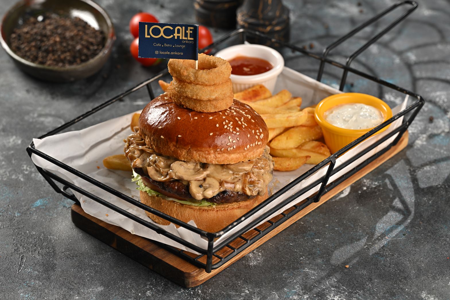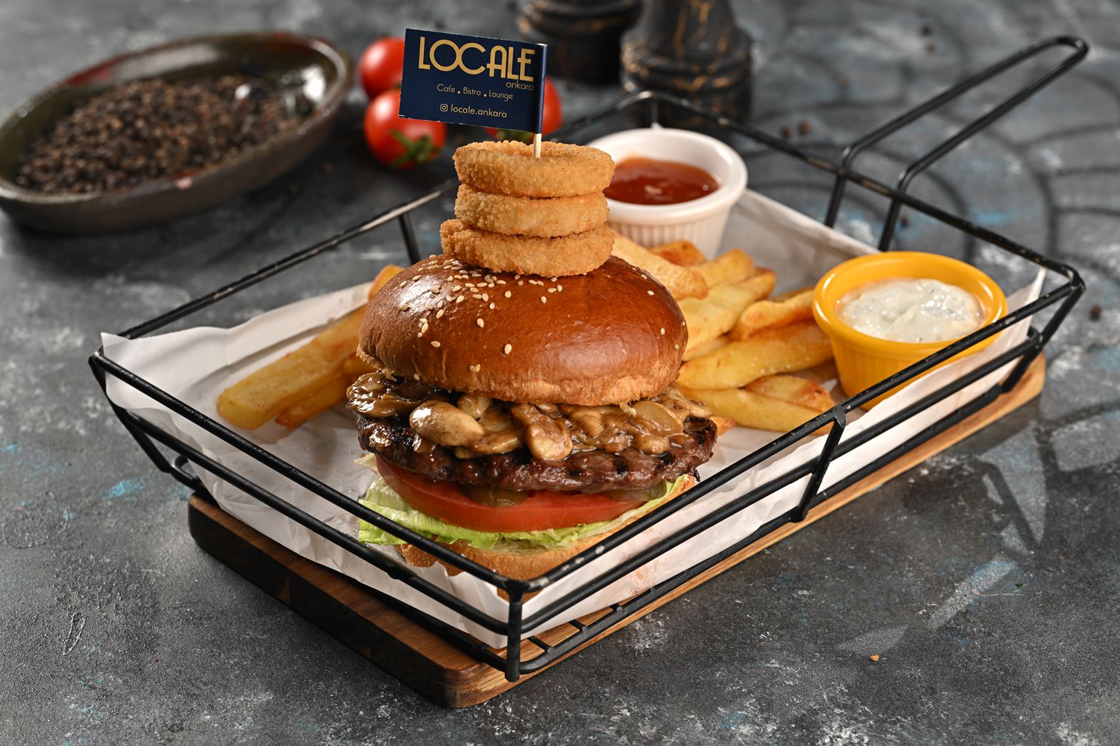 Burger Ekmegi-180 Grm Burger Köftesi-Karemelize Mantar-Krema-Soğan Halkası-Demi Glace Sos-Yeşillik-Domates-Kornişon Turşu-Sweet Chili Sos-Dip Sos Patates Kızartması Eşliginde Servis Edilir.