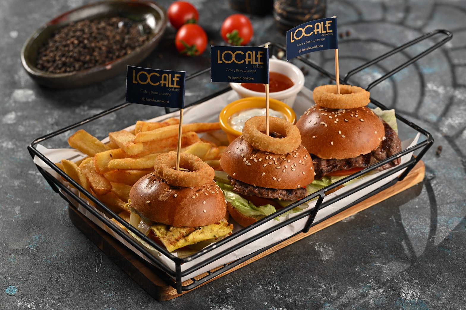 Mini Burgerler-3 Farklı Lezzet-Izgara Köfte-Dana Külbastı-Tavuk Külbastı-Yeşillik-Domates-Kornişon Turşu-Sweet Chlili Sos-Dip Sos-Patates Kızarması Eşliginde Servis Edilir.
