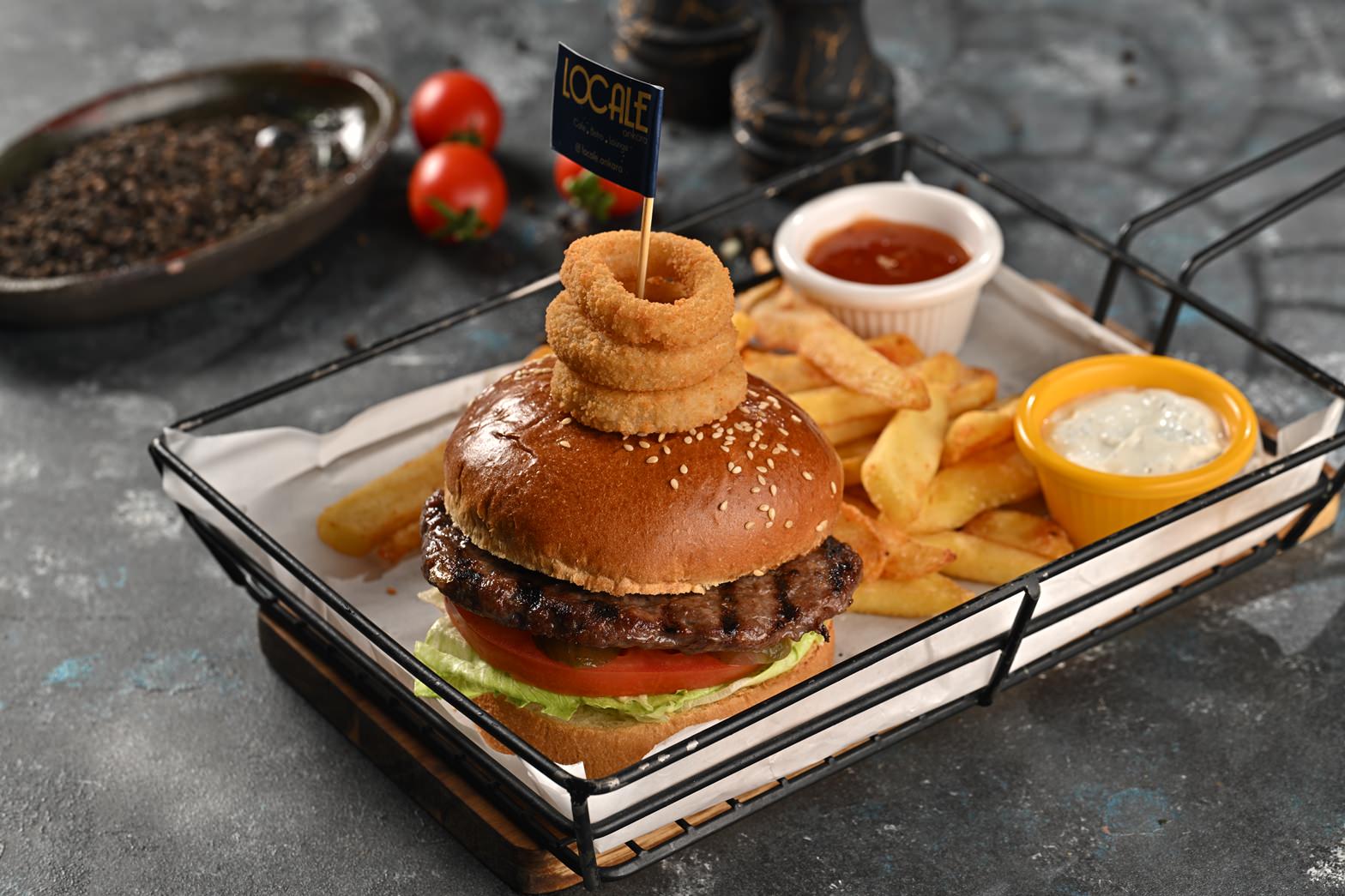 Burger Ekmegi-180 Grm Burger Köftesi-Dana Füme Eti-Karamelize Soğan-Yeşillik-Domates Kornişon Turşu-Cheese Peynir-Sweet Chili Sos-Dip Sos-Patates Kızartması Eşliğinde Servis Edilir.
