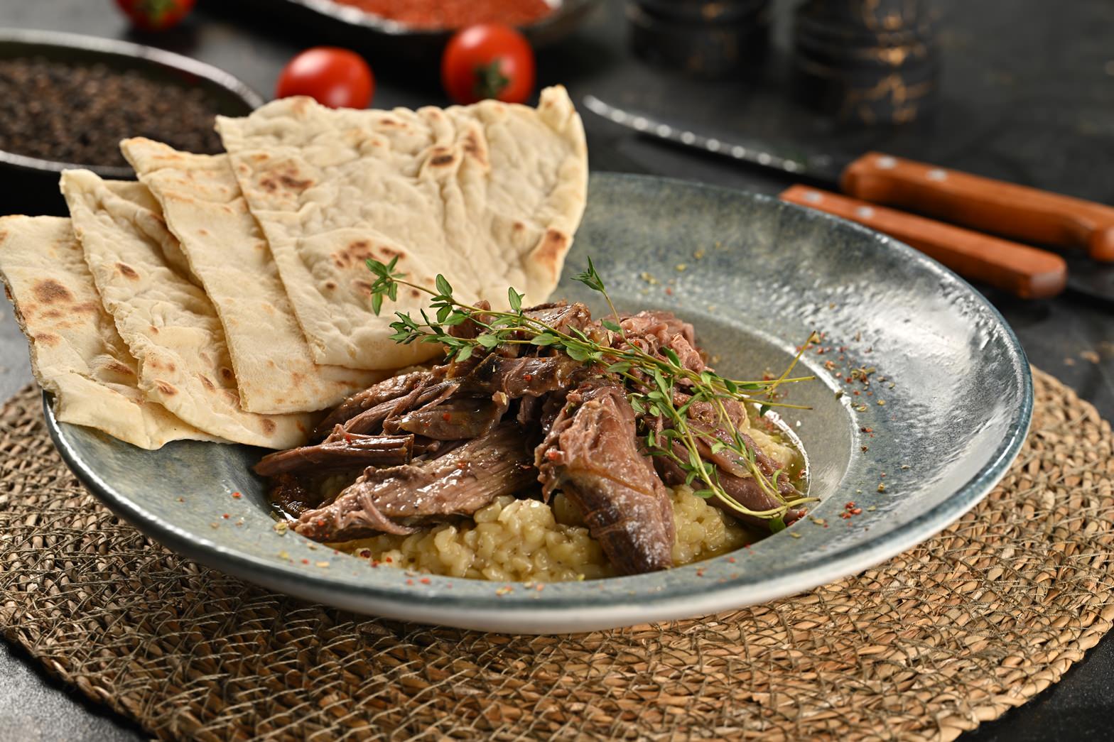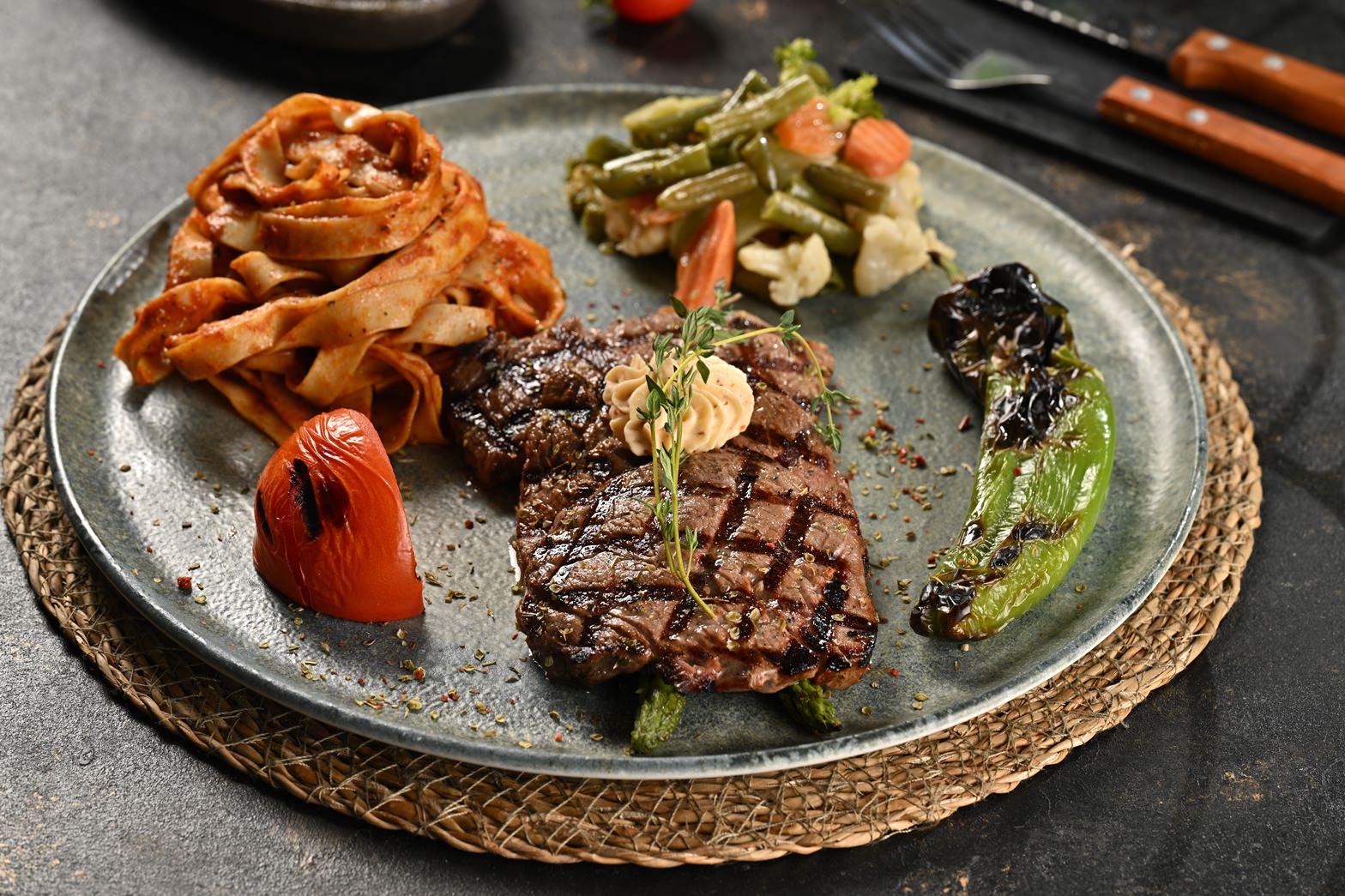 (180 Gr) Dana Bonfile, Beğendili Bazlama, Izgara Domates, Izgara Biber, Köz Sebze, Buğday Risotto ve Baby Patates ile