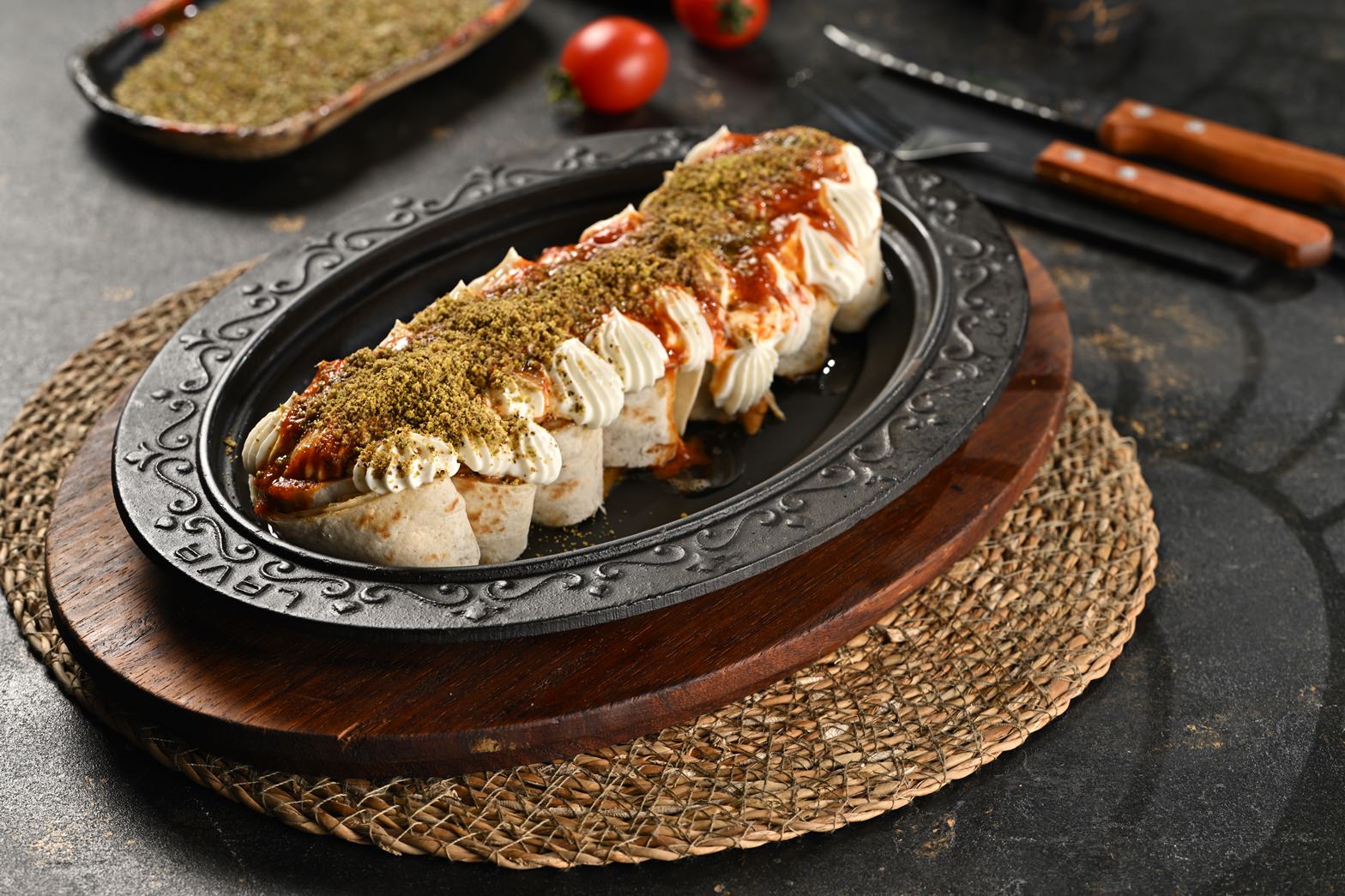 180gr. Dana Bonfile-Tortilla Ekmeğine Sarılmış Bonfile Eti-Renklii Biber-Karemalize Soğan-Krema-Yogurt-Celtik Sos-Antep Toz Fıstık-Tere Yağ Eşliginde Servis Edilir.
